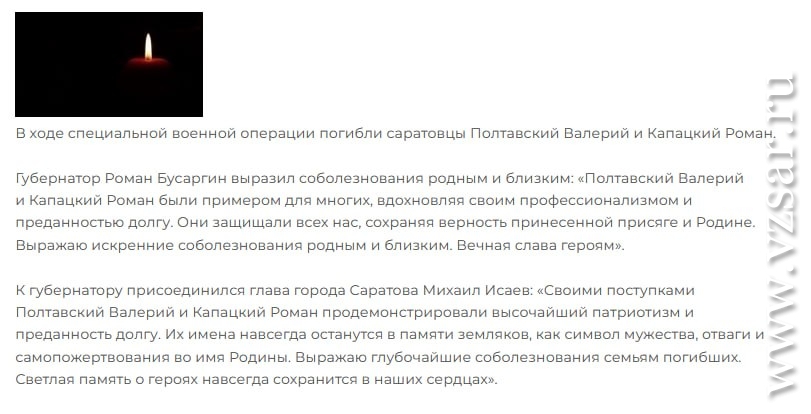 Мэрия Саратова традиционно коротко сообщает о гибели Валерия Полтавского и Романа Капацкого, а администрация Энгельсского района – о гибели Дениса Фомина.