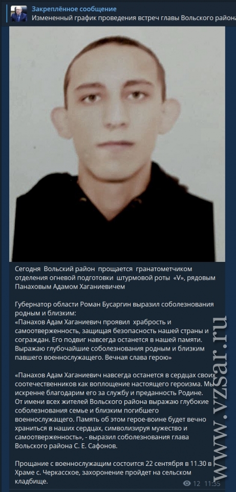 Вольский район прощается с гранатометчиком отделения огневой подготовки штурмовой роты, рядовым Адамом Панаховым, информирует райадминистрация.