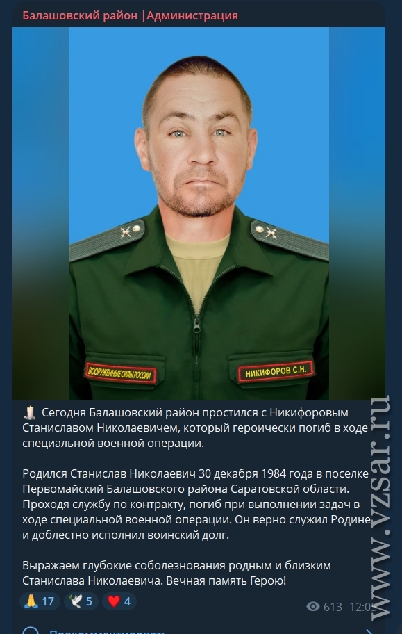 В Балашовском районе сегодня простились со Станиславом Никифоровым, сообщает райадминистрация. Родился Станислав Николаевич 30 декабря 1984 года в поселке Первомайский. Проходя службу по контракту, погиб при выполнении задач.