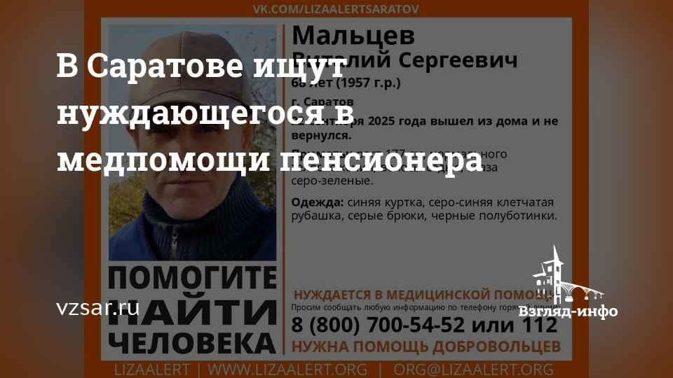 В Саратове без вести пропал 68-летний Виталий Мальцев. Об этом сообщает поисковый отряд "Лиза Алерт Саратов".