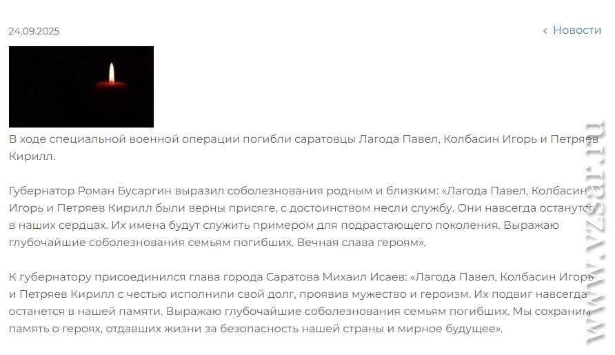 Администрация Саратова как всегда без подробностей сообщает о гибели Павла Лагоды, Игоря Колбасина и Кирилла Петряева.