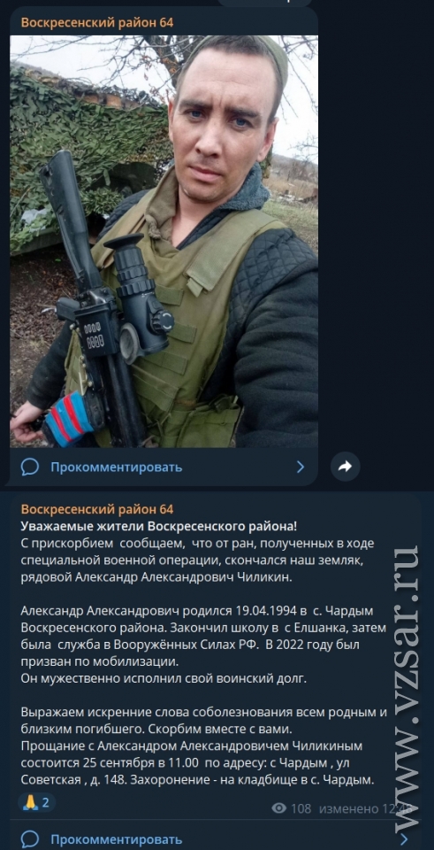 Администрация Воскресенского района рассказала, что завтра в селе Чардым пройдет прощание с погибшим ефрейтором Александром Чиликиным. Александр Александрович родился 19 апреля 1994 года в селе Чардым. Окончил школу села Елшанка, затем была служба в Вооруженных Силах РФ. В 2022 году был призван по мобилизации.