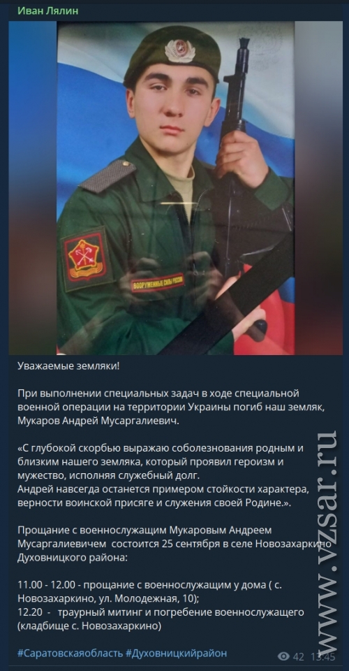 Глава Духовницкого района Иван Лялин сообщает, что завтра в селе Новозахаркино пройдет прощание с погибшим Андреем Мукаровым.