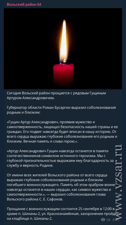 Администрация Вольского района сообщает, что сегодня состоится прощание с рядовым Артуром Гущиным. Захоронение пройдет на кладбище п. Шиханы-2.