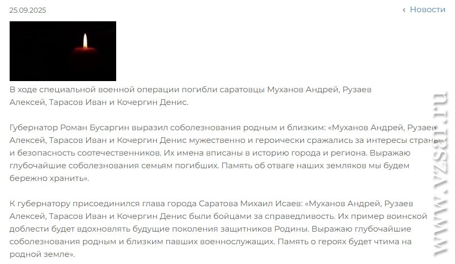 Администрация Саратова традиционно без подробностей биографий рассказала о гибели Андрея Муханова, Алексея Рузаева, Ивана Тарасова и Дениса Кочергина.