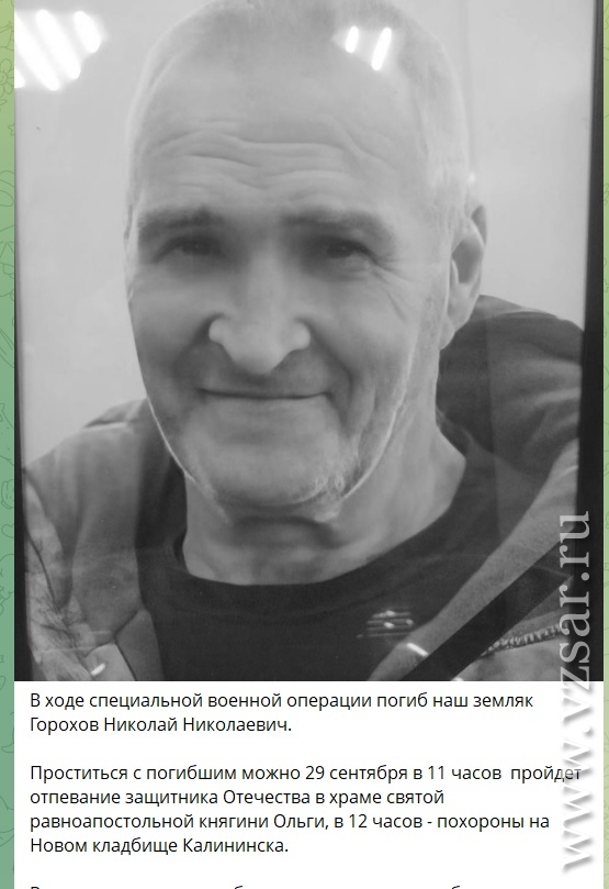 Глава администрации Калининского района Валерий Лазарев сообщил о том, что с фронта не вернулся живым Николай Горохов.