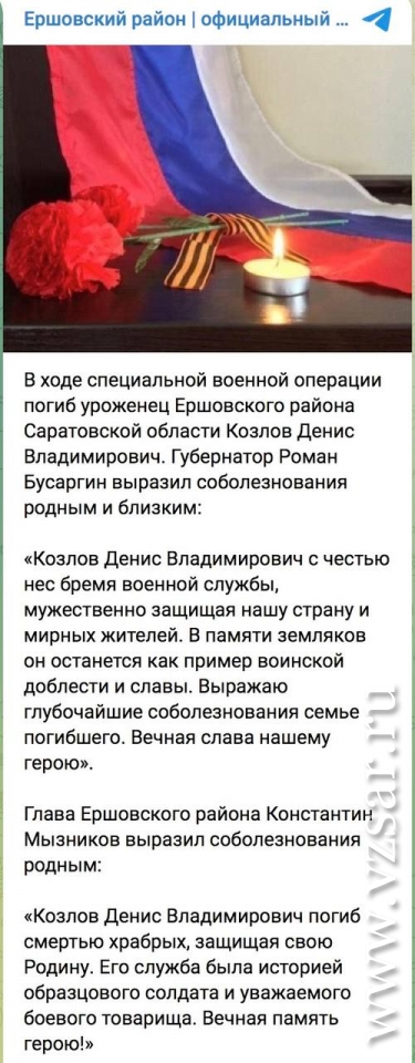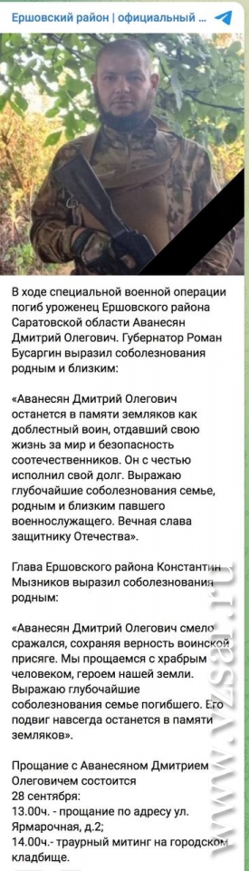 Так, администрация Ершовского района сообщает о гибели Дмитрия Аванесяна и Дениса Козлова. С первым из них простились сегодня.