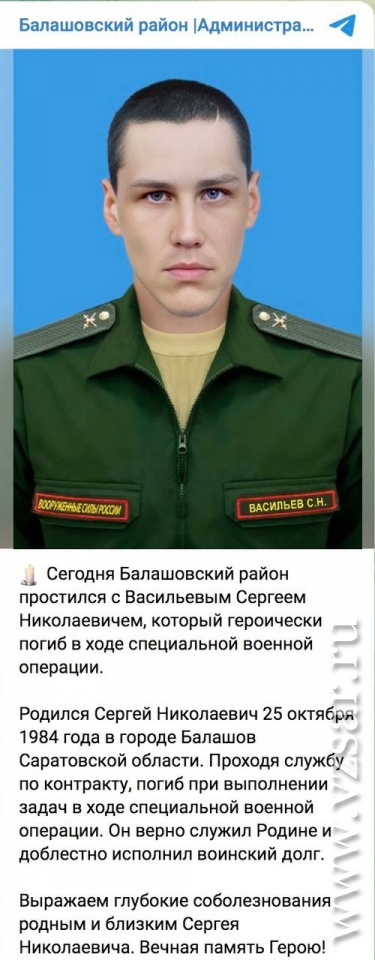 Сегодня Балашовский район простился с Сергеем Васильевым, информирует райадминистрация. Родился Сергей Николаевич 25 октября 1984 года в Балашове. Проходя службу по контракту, погиб при выполнении задач.
