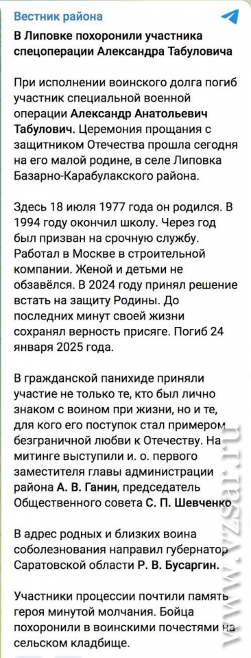 В селе Липовка вчера простились с Александром Табуловичем, сообщает Базарно-Карабулакского издание "Вестник района". Он родился в Липовке 18 июля 1977 года. В 1994 году окончил школу. Через год был призван на срочную службу. Работал в Москве в строительной компании. В 2024 году принял решение встать на защиту Родины. Погиб 24 января 2025 года.