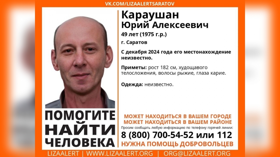 В Саратове без вести пропал 49-летний Юрий Караушан. Об этом сообщает поисковый отряд "Лиза Алерт Саратов".