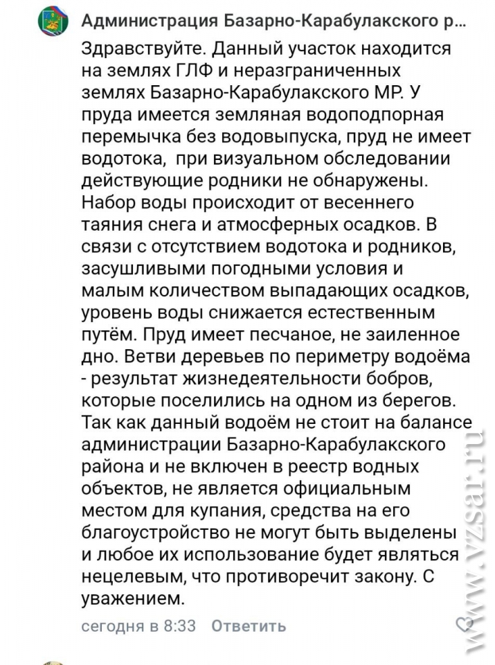 Ответ, который мне предоставила администрация Базарно-Карабулакского района, я считаю формальной отпиской. Они сослались на малое количество осадков и на то, что пруд не находится на их балансе, и поэтому средства на его благоустройство выделены не будут.