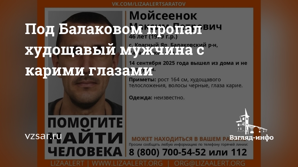 Две недели назад в Балаковском районе пропал 46-летний Максим Мойсеенок, сообщает поисковый отряд "ЛизаАлерт Саратов".