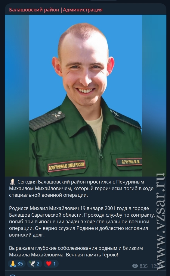 Администрация Балашовского района рассказала о прошедшем прощании с погибшим Михаилом Печуриным.