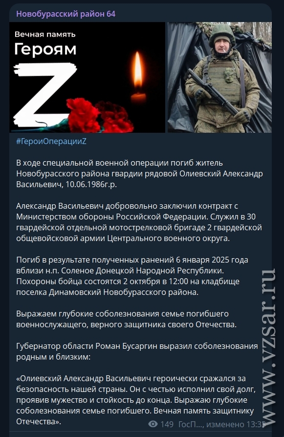 Администрация Новобурасского района рассказала о гибели Александра Олиевского.