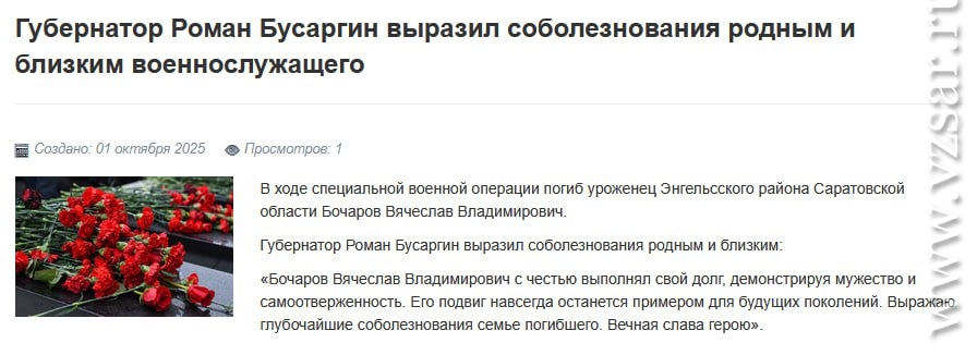 Администрация Саратова без подробностей сообщает о гибели Евгения Фадеева, Дмитрия Арсентьева, Вячеслава Кирсанова, Дениса Саблина, Антона Преснякова и Алексея Зрелика, а администрация Энгельсского района – о гибели Вячеслава Бочарова.