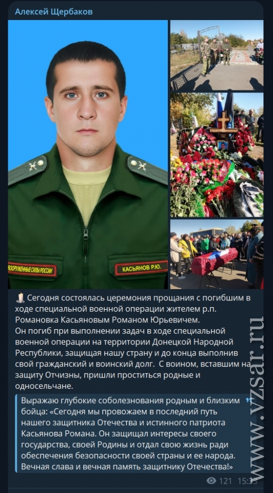 Глава Романовского района Алексей Щербаков рассказал, что сегодня в райцентре прошло прощание с погибшим Романом Касьяновым.