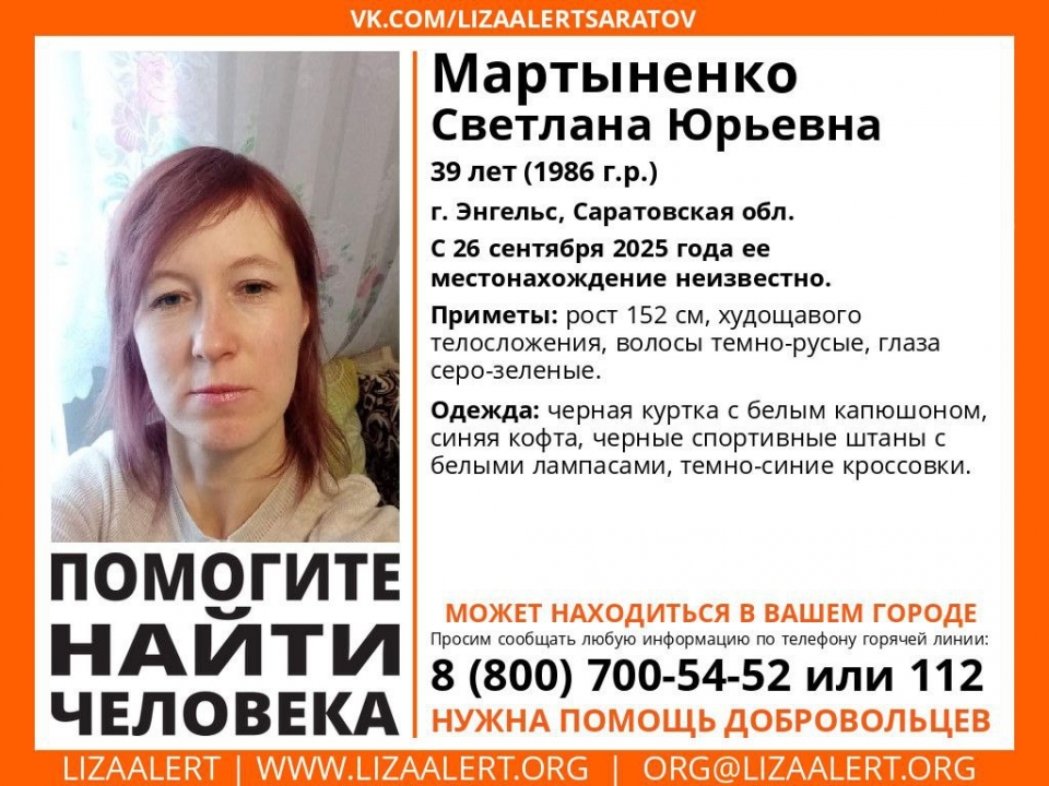 В Энгельсе без вести пропала 39-летняя Светлана Мартыненко. Об этом сообщает поисковый отряд "Лиза Алерт Саратов".