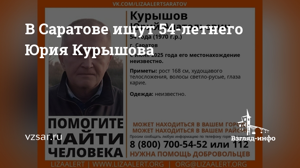 В Саратове без вести пропал 54-летний Юрий Курышов. Об этом сообщает поисковый отряд "Лиза Алерт Саратов".
