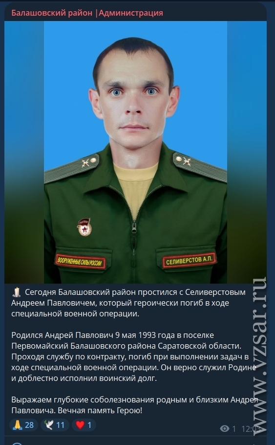 Администрация Балашовского района рассказала о сегодняшнем прощании с погибшим Андреем Селиверстовым.