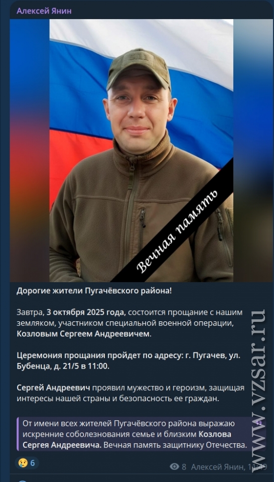 Глава Пугачевского района Алексей Янин сообщает, что завтра в райцентре пройдет прощание с погибшим Сергеем Козловым.