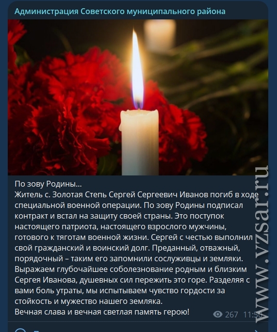 Администрация Советского района рассказала о гибели жителя села Золотая Степь Сергее Иванове.