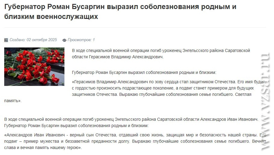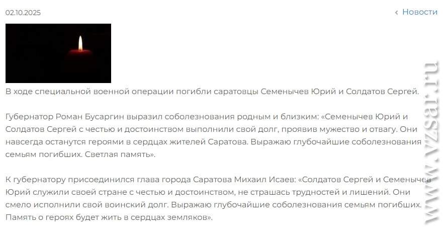 Администрация Саратова без подробностей сообщает о гибели Юрия Семенычева и Сергея Солдатова, а администрация Энгельсского района – о гибели Владимира Герасимова и Ивана Александрова.