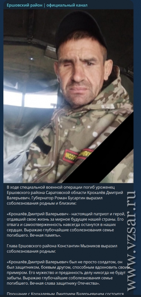Также администрация Ершовского района сообщает, что завтра в селе Чапаевка состоится прощание с погибшим Дмитрием Крохалевым.