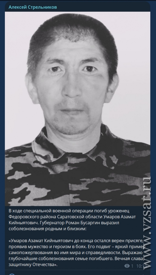 Глава Федоровского района Алексей Стрельников сообщил о гибели Азамата Умарова.