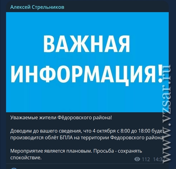 По данным главы Федоровского района Алексея Стрельникова, с 8.00 до 18.00 будет производиться облет БПЛА на территории района.