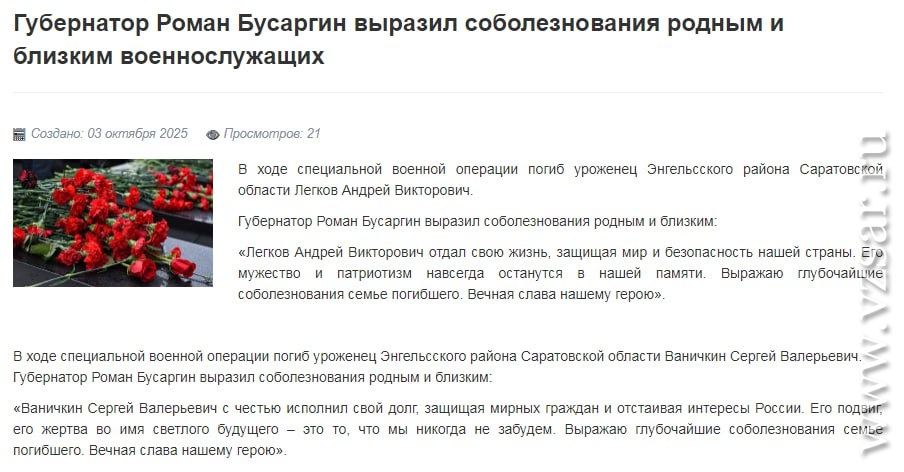 Администрация Энгельсского района без подробностей сообщает о гибели Андрея Легкова и Сергея Ваничкина.