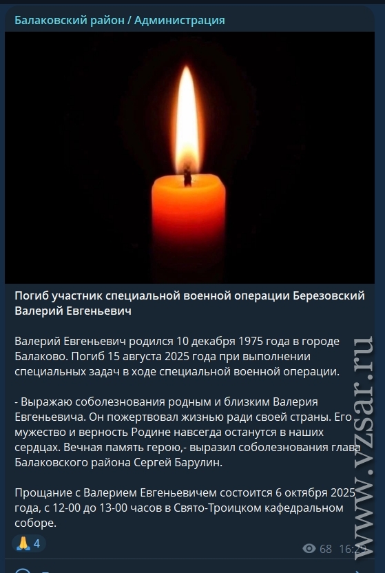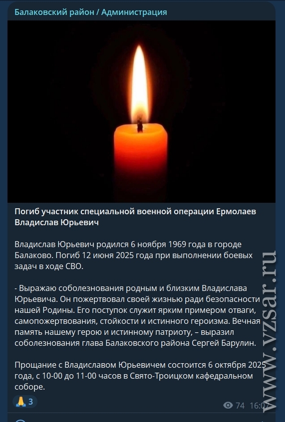 Администрация Балаковского района рассказывает, что в понедельник 6 октября пройдет прощание с погибшими Владиславом Ермолаевым и Валерием Березовским.