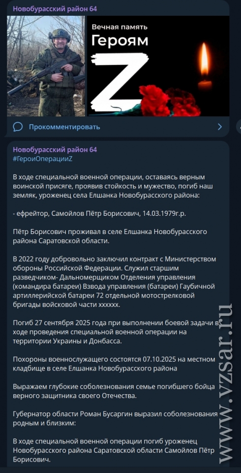 О погибшем ефрейторе Петре Самойлове рассказала администрация Новобурасского района.