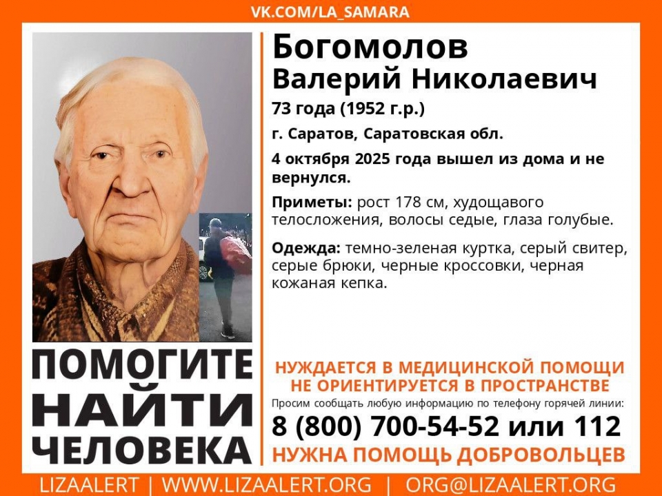 В Саратове ищут без вести пропавшего 73-летнего Валерия Богомолова. Об этом сообщает поисковый отряд "Лиза Алерт Саратов".