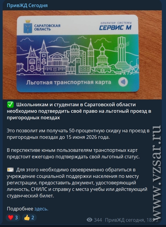 "Школьникам и студентам в Саратовской области необходимо подтвердить свое право на льготный проезд в пригородных поездах. Это позволит им получать 50-процентную скидку на проезд в пригородных поездах до 15 июня 2026 года.