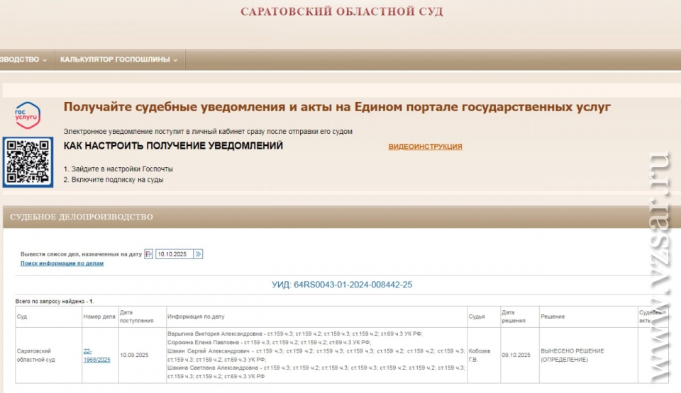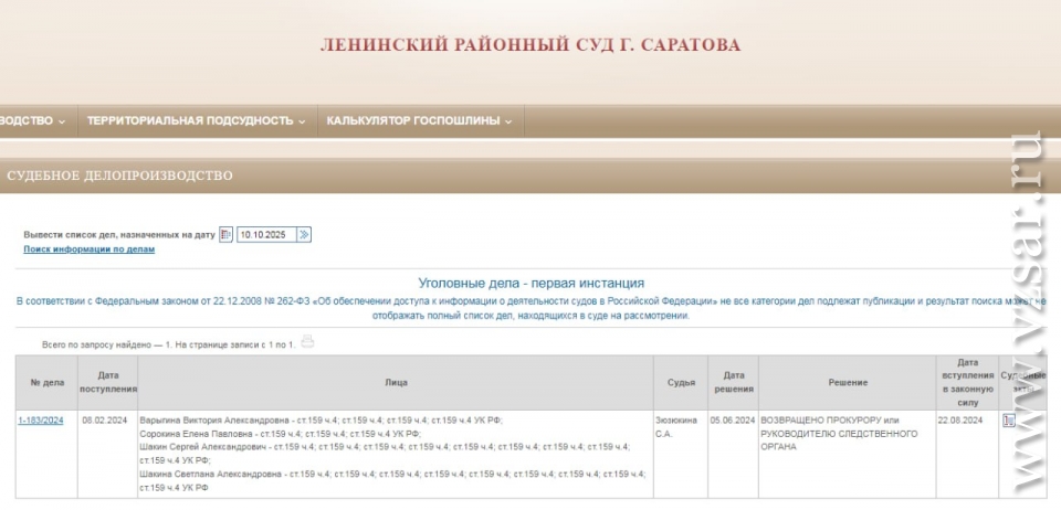 Перед Новым годом уголовное дело поступило уже в Волжский райсуд Саратова (вероятно, подсудность изменилась с уточнением места совершения преступления).