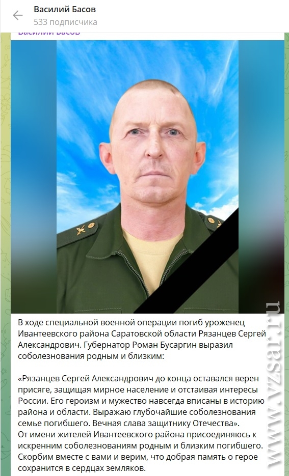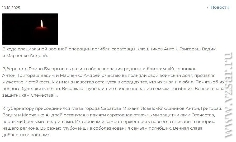 Администрация Саратова сообщает о гибели Антона Клюшникова, Вадима Григораша и Андрея Марченко.