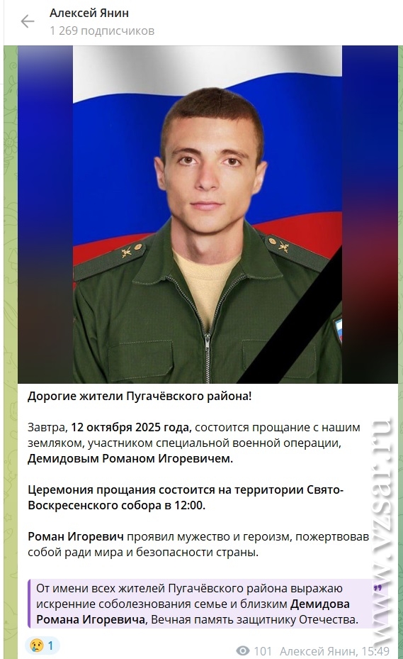 Глава Пугачевского района Алексей Янин уведомил о завтрашнем прощании с Романом Демидовым; его проводят в последний путь в 12.00 на территории Свято-Воскресенского собора райцентра.