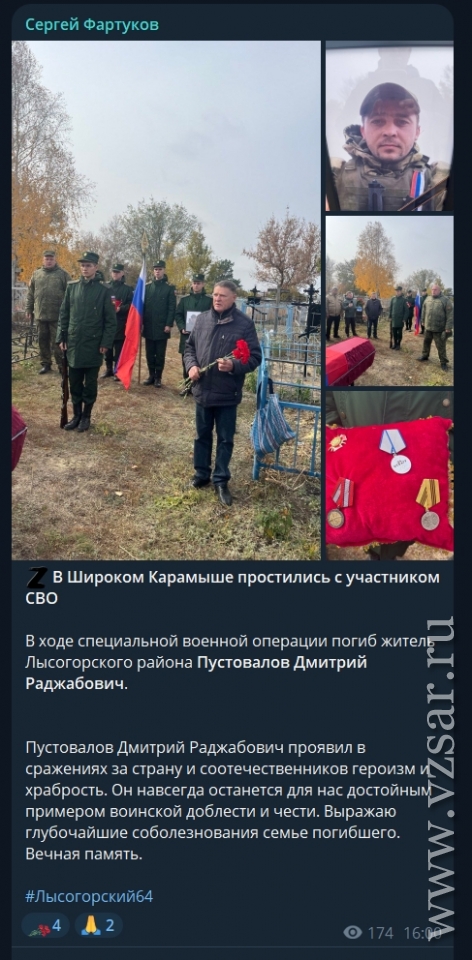 Глава Лысогорского района Сергей Фартуков рассказал, что в Широком Карамыше простились с погибшим Дмитрием Пустоваловым.