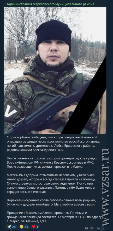 Администрация Марксовского района сообщает, что сегодня пройдет прощание с погибшим рядовым Максимом Ганиным.