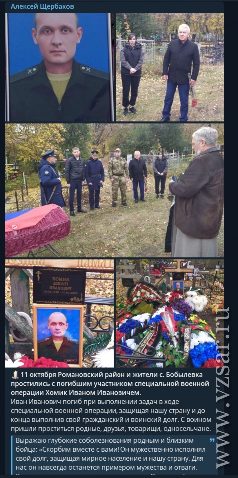 Глава администрации Романовского района Алексей Щербаков рассказал о прошедшем прощании с двумя погибшими: в селе Бобылевка простились с Иваном Хомиком, а в поселке Красноармейский – с Александром Кабановым.