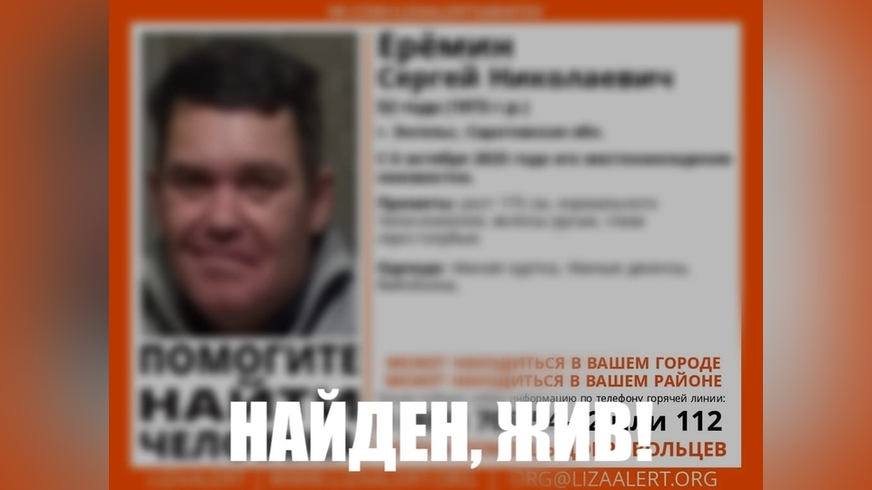 В Энгельсе Саратовской области нашли живым 52-летнего Сергея Еремина. Об этом сообщает поисковый отряд "Лиза Алерт Саратов".