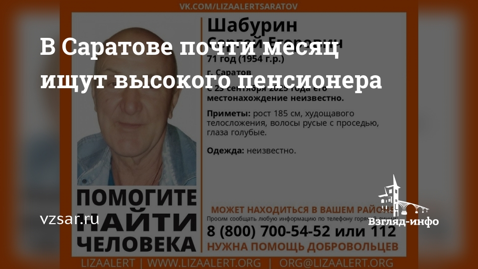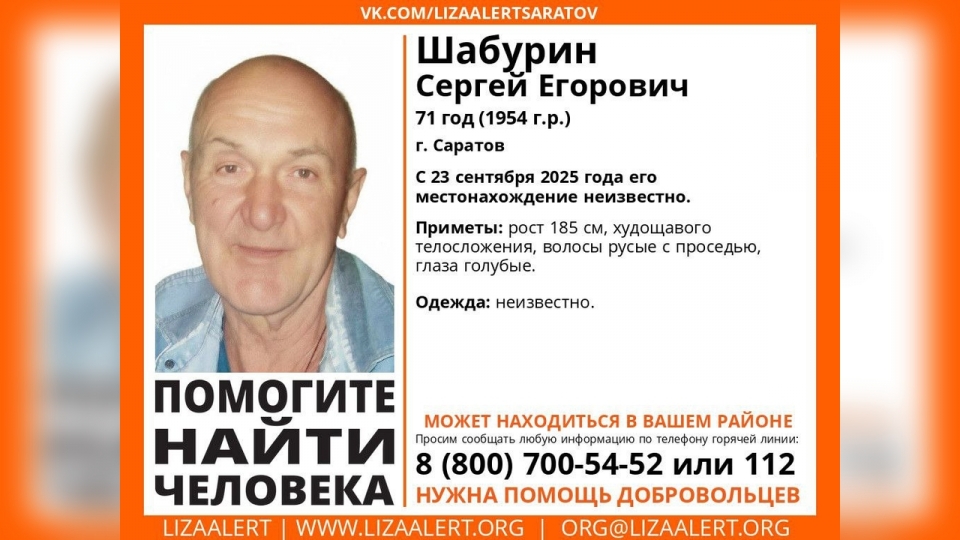 В Саратове без вести пропал 71-летний Сергей Шабурин. Об этом сообщает поисковый отряд "Лиза Алерт Саратов".