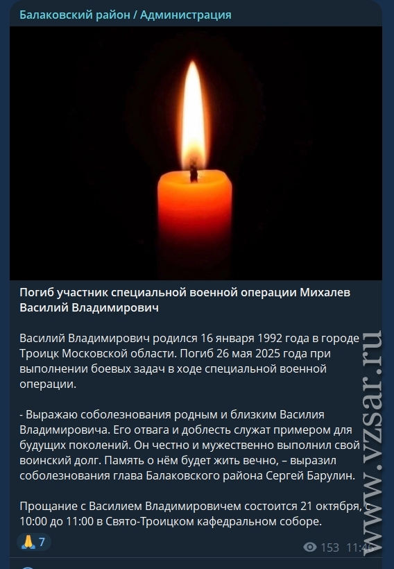 Также администрация Балаковского района рассказала, что завтра состоится прощание с погибшим Василием Михалевым.