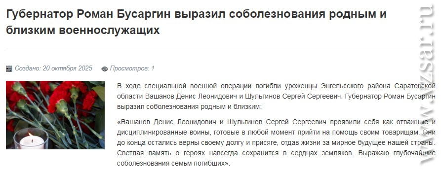 Администрация Энгельсского района без подробностей сообщила о гибели Дениса Вашанова и Сергея Шульгинова.