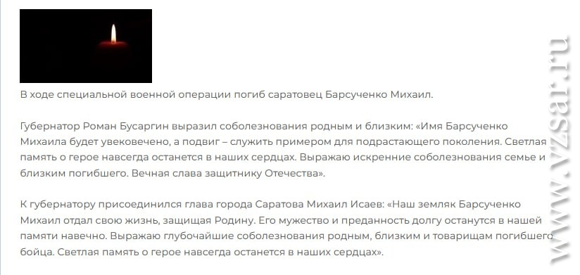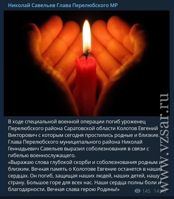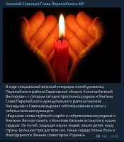 Глава Перелюбского района Николай Савельев рассказал о гибели Евгения Колотова, а администрация Саратова – о погибшем Михаиле Барсученко.