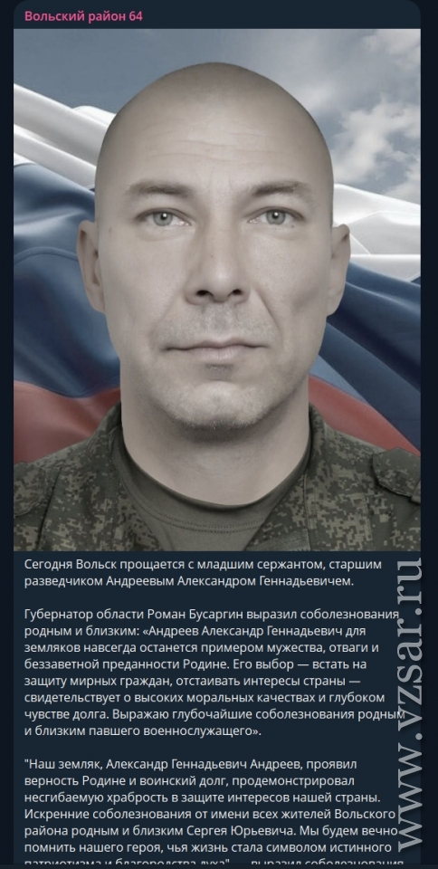 Администрация Вольского района сообщает о сегодняшнем прощании с младшим сержантом, старшим разведчиком Александром Андреевым.