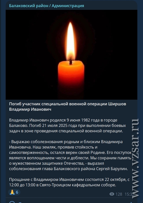 Администрация Балаковского района уведомила, что завтра пройдет прощание с Владимиром Ширшовым.