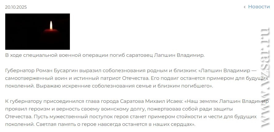 Администрация Саратова без подробностей сообщила о гибели Владимира Лапшина.