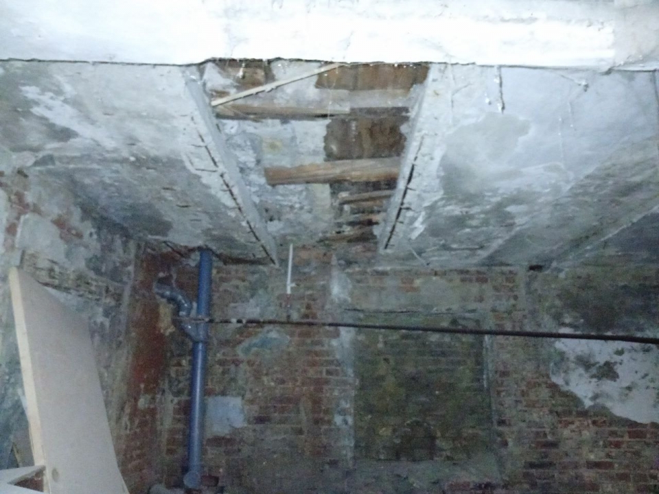 Мы спускаемся в подвал. Жители поведали, что когда-то там была жилая квартира, потом – местный ЖЭК, а затем окна заложили кирпичами. В том месте, где рухнула плита, остались только доски пола, опирающиеся на балки.