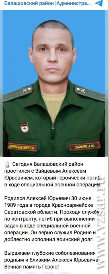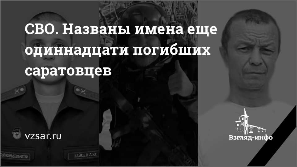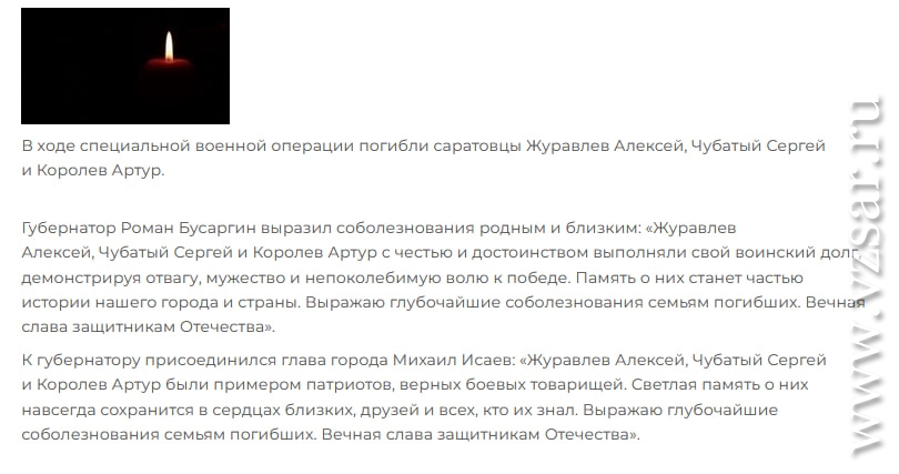 Мэрия Саратова традиционно коротко сообщает о гибели Алексея Журавлева, Сергея Чубатого и Артура Королева, а администрация Энгельсского района – о гибели Алексея Маркова, Ивана Кирьянова и Николая Кузьмина.